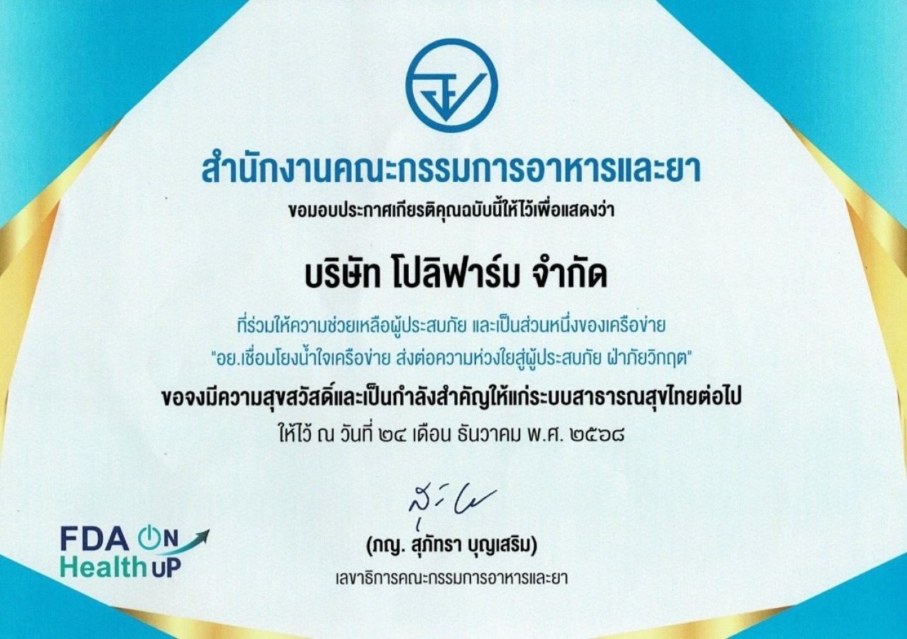 มอบประกาศเกียรติคุณแก่บริษัท โปลิฟาร์ม จำกัด ที่ร่วมให้ความช่วยเหลือบริจาคเวชภัณฑ์แก่ผู้ประสบภัย